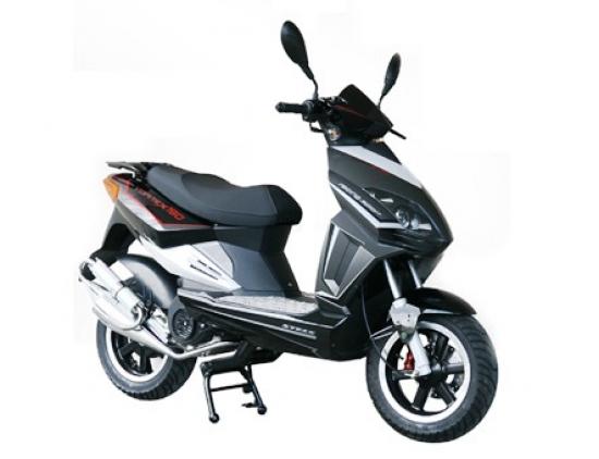 Двигатель: 2-тактный; 150 куб.см; 9,7 л.с.; охлаждение воздушное принудительное Трансмиссия: вариатор; Система запуска:: электростартер, кик-стартер ; Система зажигания: электронное CDI. Подвеска передняя: гидравлическая Передний/задний тормоз: дисковый гидравлический, с ручным приводом/механический барабанный, с ручным приводом Емкость топливного бака, л.: 4,8 Колеса передние/задние: 120/70-12" /130/70-12"; Диски: Al Габаритные размеры: 183х69х114,5; Колесная база: 127; Сухой вес, кг: 101 Доп. комплектация: Зеркала/Сигнализация/Спортивный глушитель/Чехол